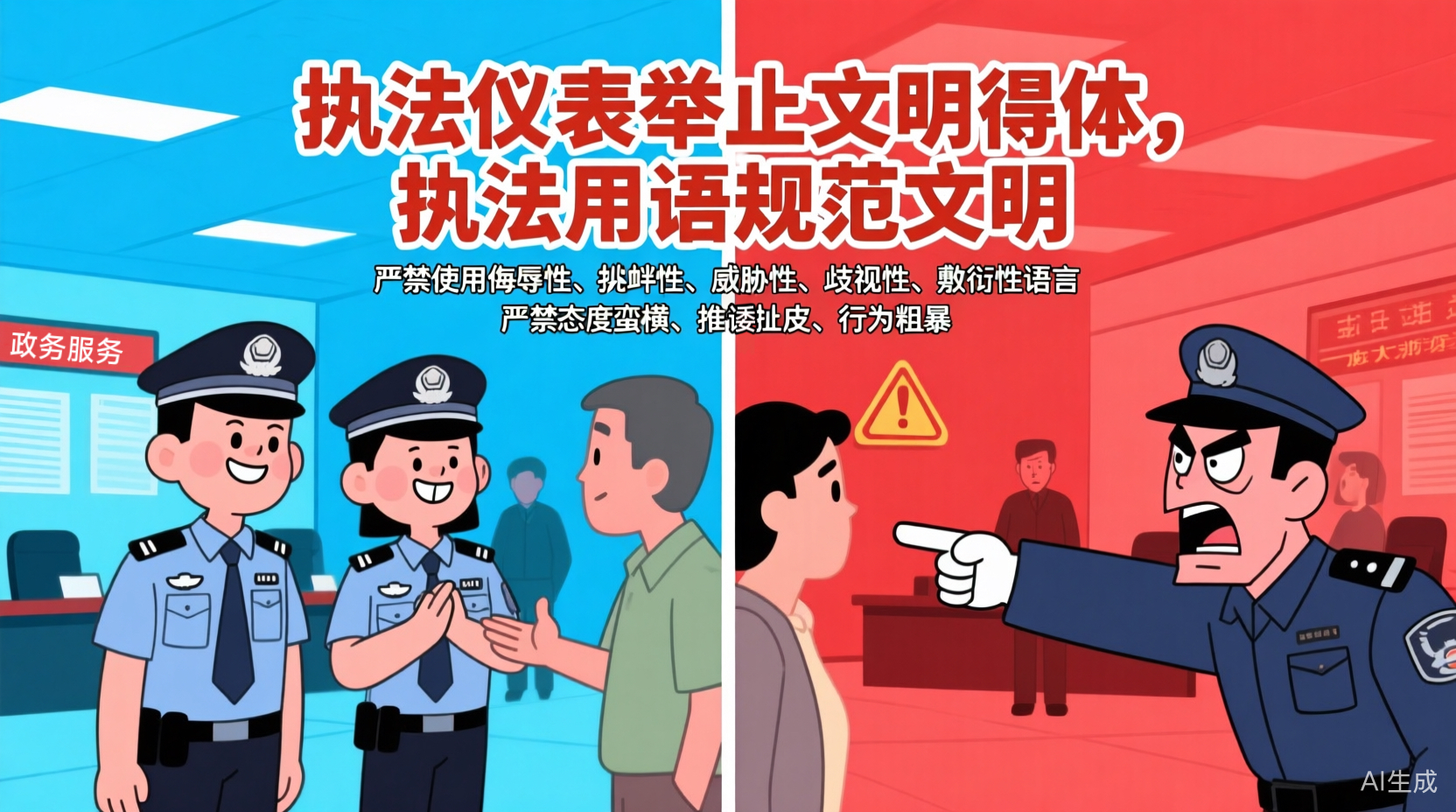 执法仪表举止文明得体,执法用语规范文明,尊重当事人和利害关系人。严禁使用侮辱性、挑衅性、威胁性、歧视性、敷衍性语言。严禁态度蛮横、推诿扯皮、行为粗暴。 七、严格做到执法与服务相结合。