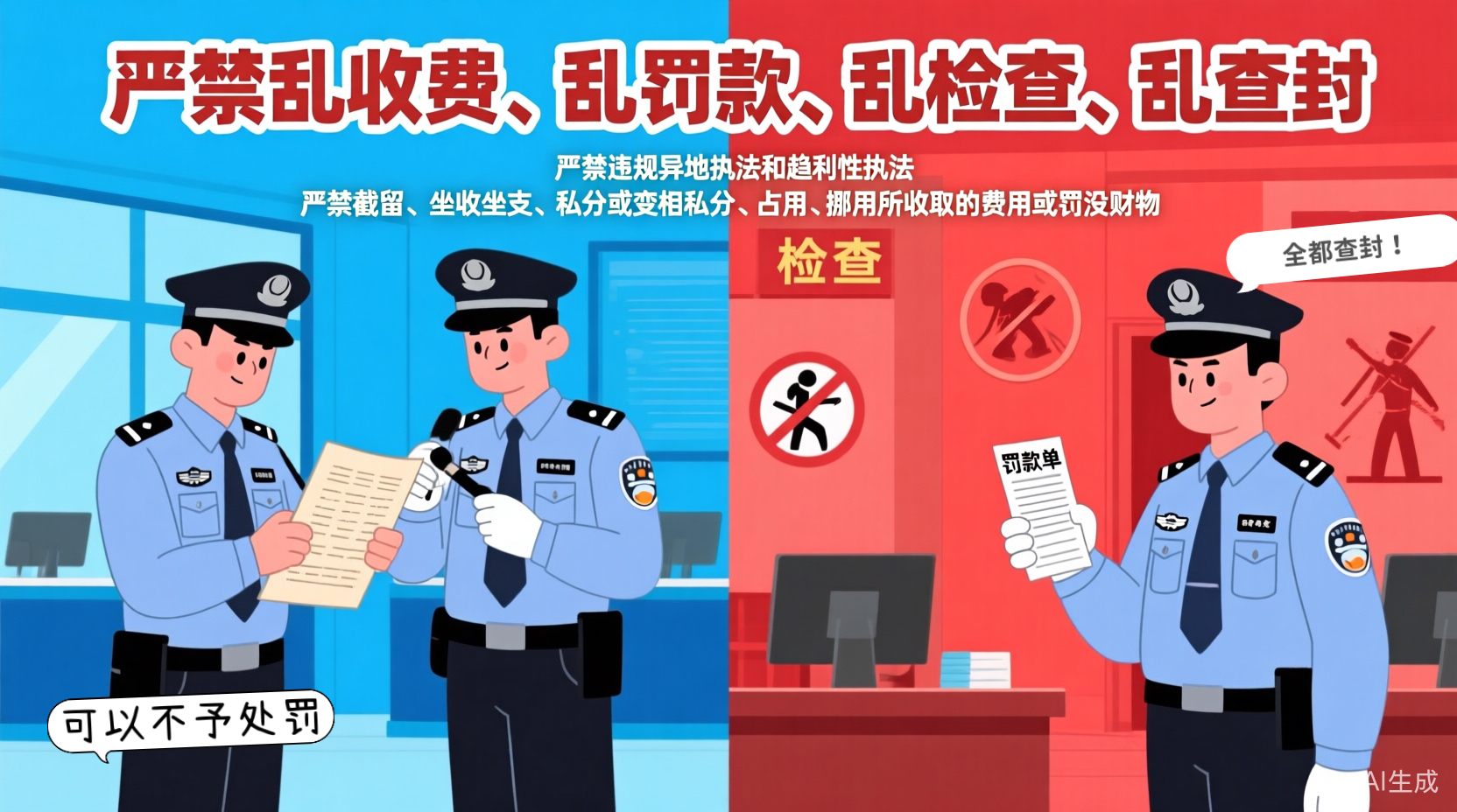 严禁乱收费、乱罚款、乱检查、乱查封。严禁违规异地执法和趋利性执法。严禁下达或变相下达罚没指标。严禁截留、坐收坐支、私分或变相私分、占用、挪用所收取的费用或罚没财物。 四、严格做到公正执法。